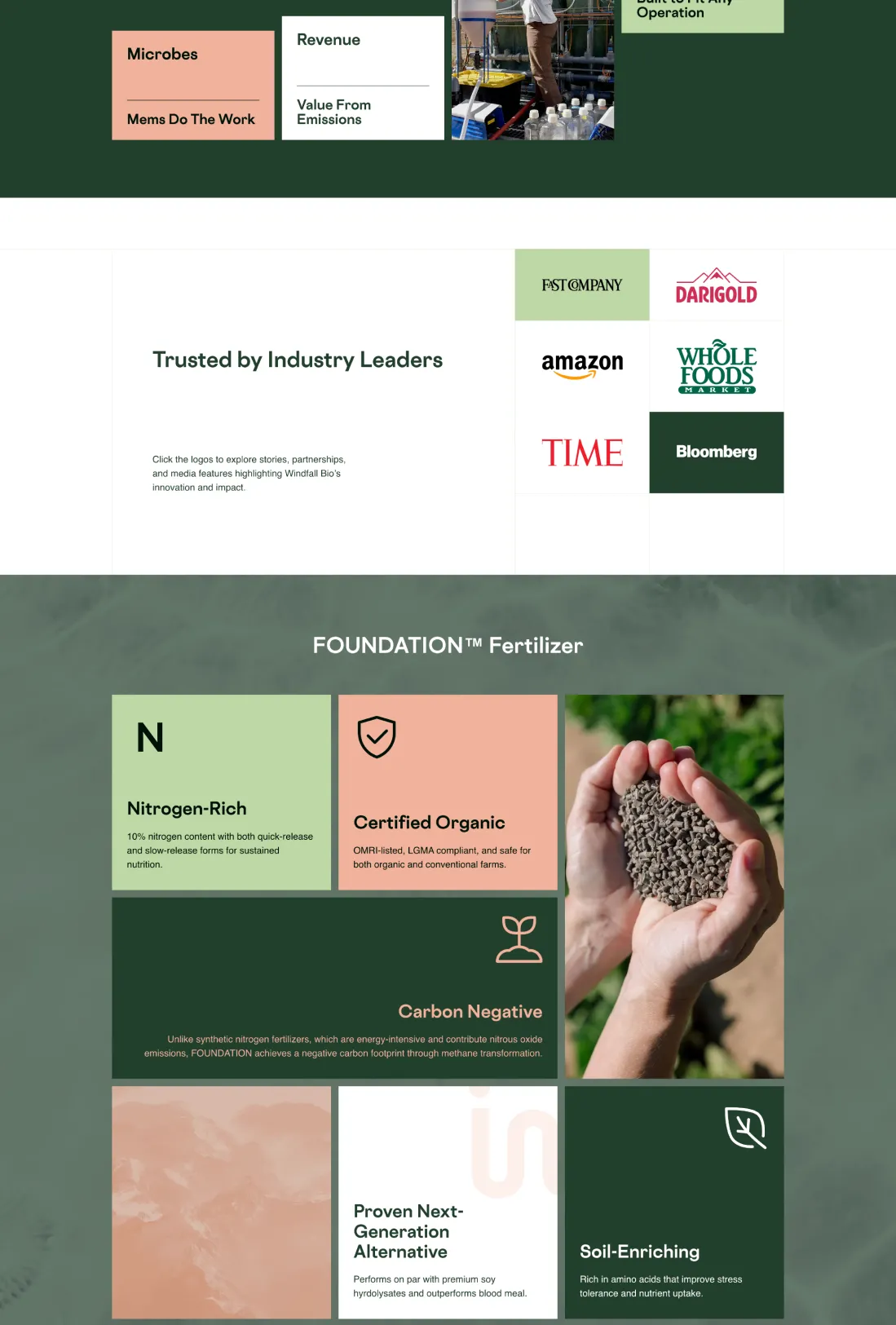 Windfall Bio secured a $28 Million Series A Funding Round thanks to their new Webflow website, which showcases their innovative methane-to-fertilizer solution and their commitment to sustainable agriculture.